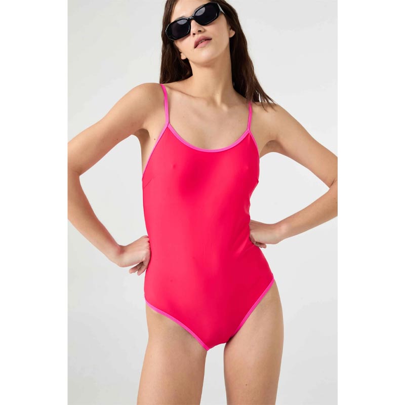 Descubre la Malla Costa Brava, una elegante enteriza con cuello redondo y copas removibles que se adapta a tu figura.