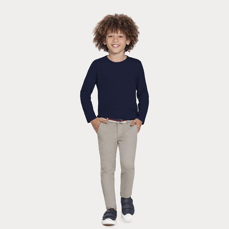 La camiseta básica de manga larga en punto medio es esa prenda cómoda y calentita para cada momento de tu peque. En tono neutro, queda precioso combinado con jeans o pantalones camuflados, además de permitir varias superposiciones con chaquetas y camisetas.